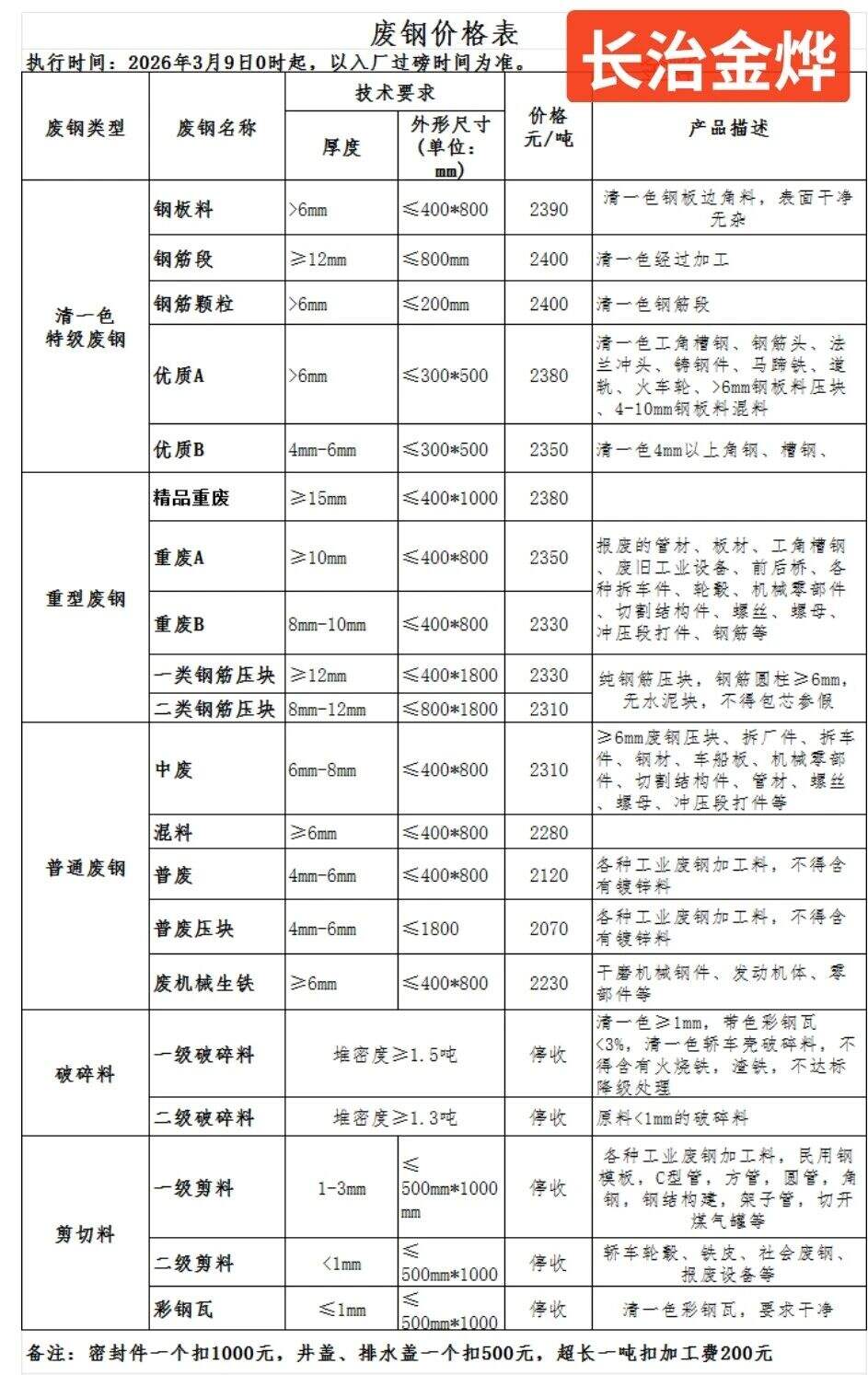 一級破碎料停收,二級破碎料停收,一級剪料停收,二級剪料停收,彩鋼瓦停收。
