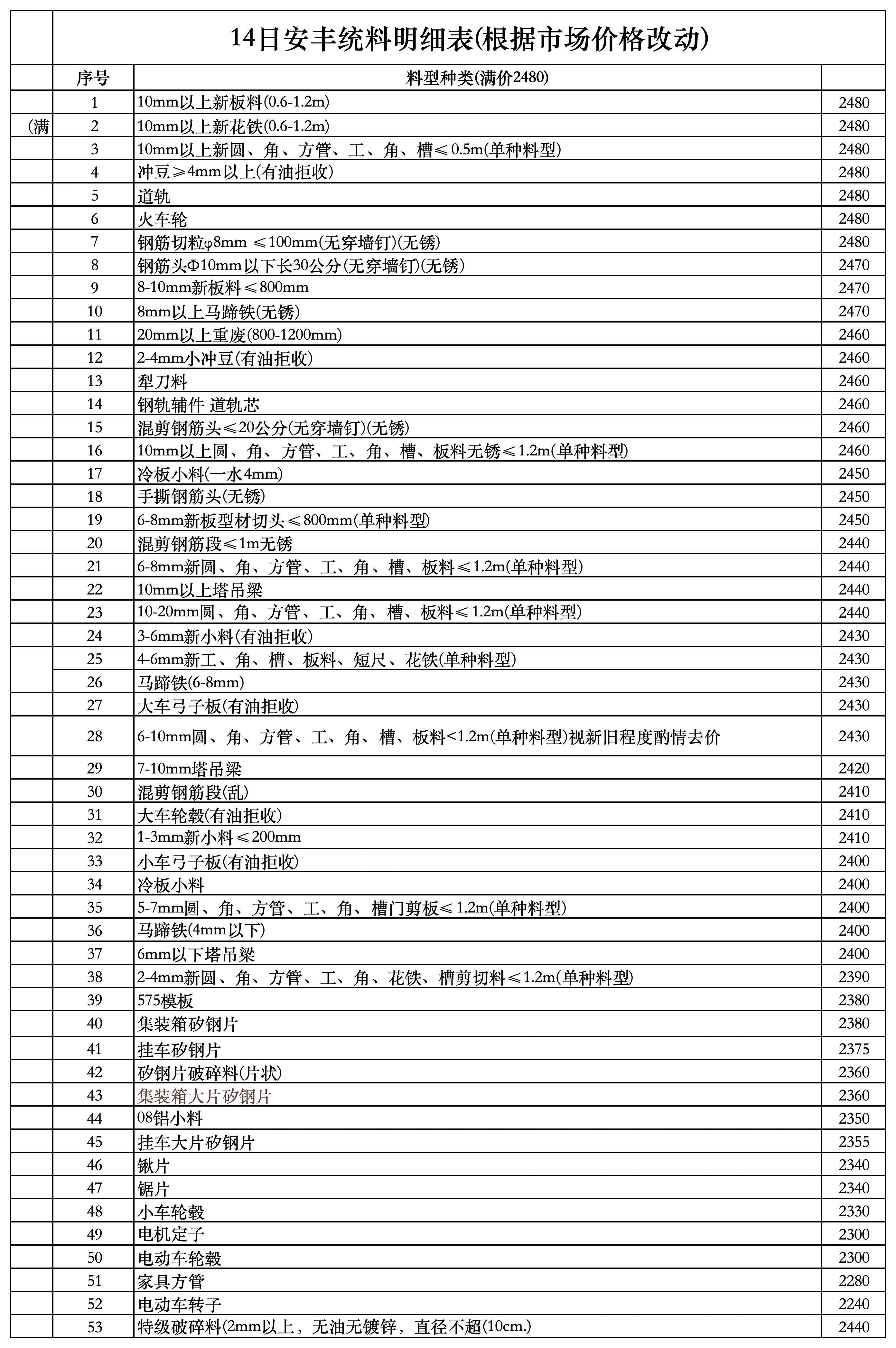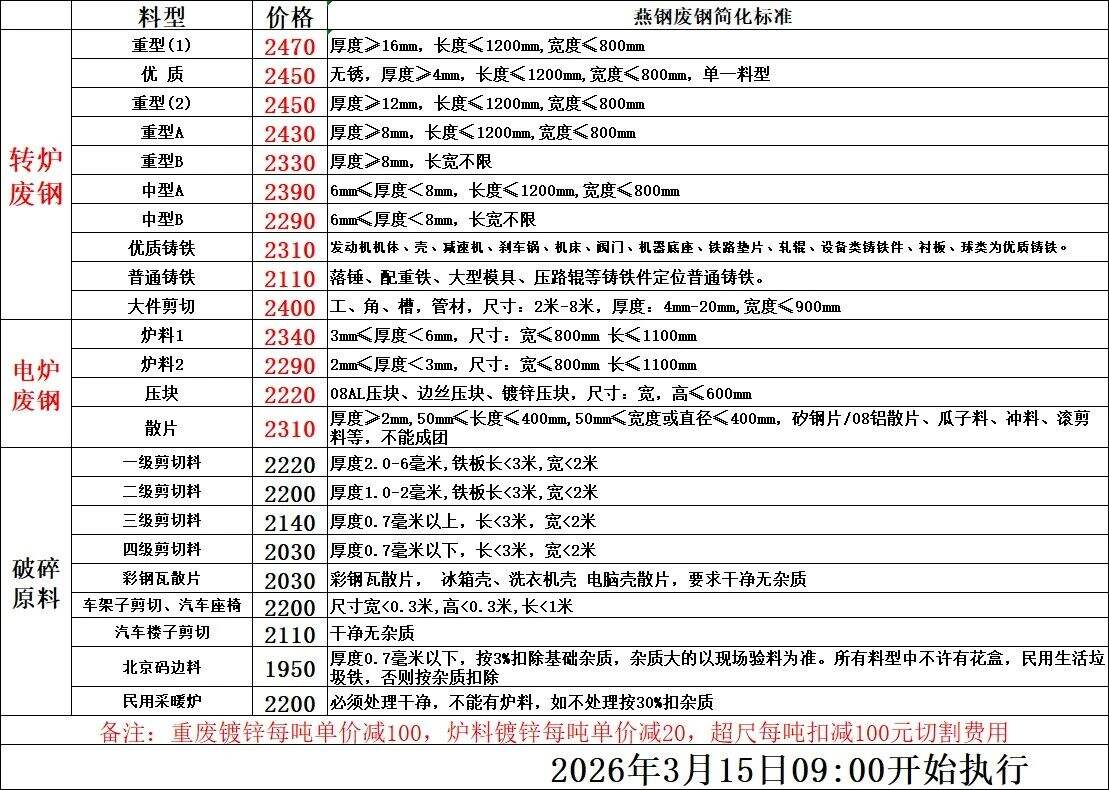 汽車底盤酸洗板*.*,精品打包塊*.*,**鋁散片*.*,精品打包塊*.*,小型加工廢鋼*.*,精品打包塊*.*,新鐵板料*.*,普通打包塊*.*上調(diào)**元/噸;中、重廢類上調(diào)**元/噸,其他料型不做調(diào)整。執(zhí)行時(shí)間****