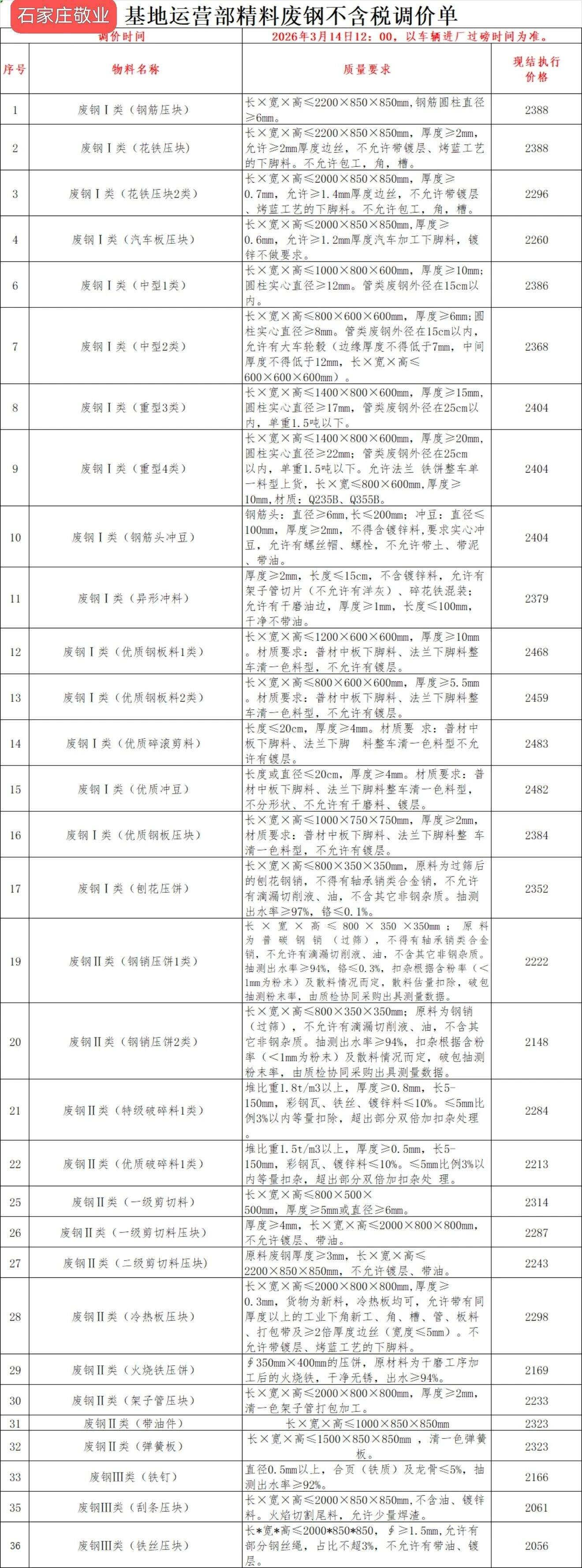 敬業(yè)通知:*月**日**點(diǎn)起本部廢鋼價(jià)格調(diào)整,具體詳見價(jià)格表。
